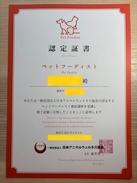 ペットフーディストは、日本アニマルウェルネス協会が認定している資格です。